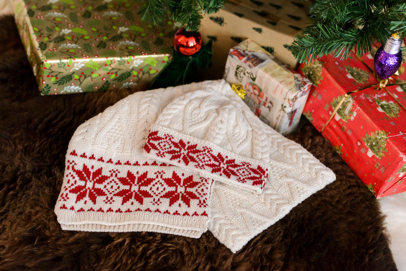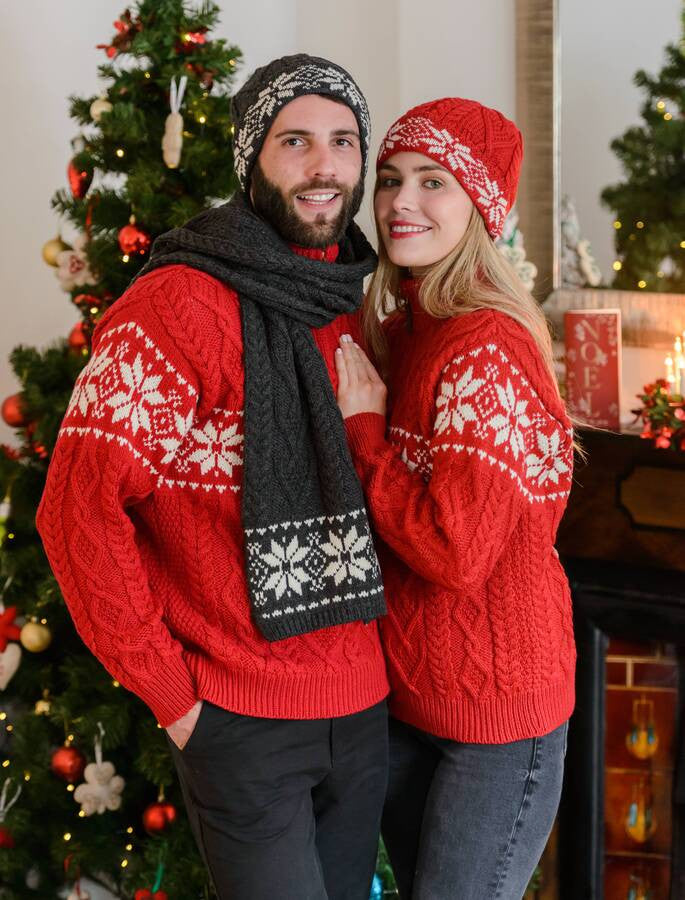 Embrace the chill in style with our Fairisle Snowflake Aran Scarf, a winter essential featuring a classic Fair Isle snowflake design. Available in seasonal shades of natural white, red, and charcoal, this scarf blends traditional Aran craftsmanship with timeless festive charm.