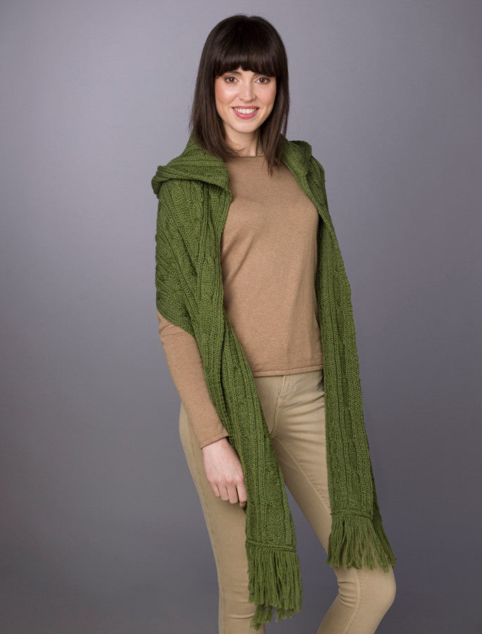 This Hooded Scarf Shawl is a unique and practical design featuring the popular Cable Aran stitch throughout. It can be worn as an outer garment to replace a hat and scarf or draped simply over a coat or sweater to give a snugly, warm feel.