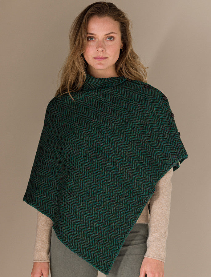 The Herringbone Merino Poncho with Button Detail is a modern take on classic Irish design. This garment, while featuring a herringbone pattern in complimentary color, is the ideal companion for any woman as it is comfortable, practical and flattering for all body shapes. Can also do double duty as a button-up cape.