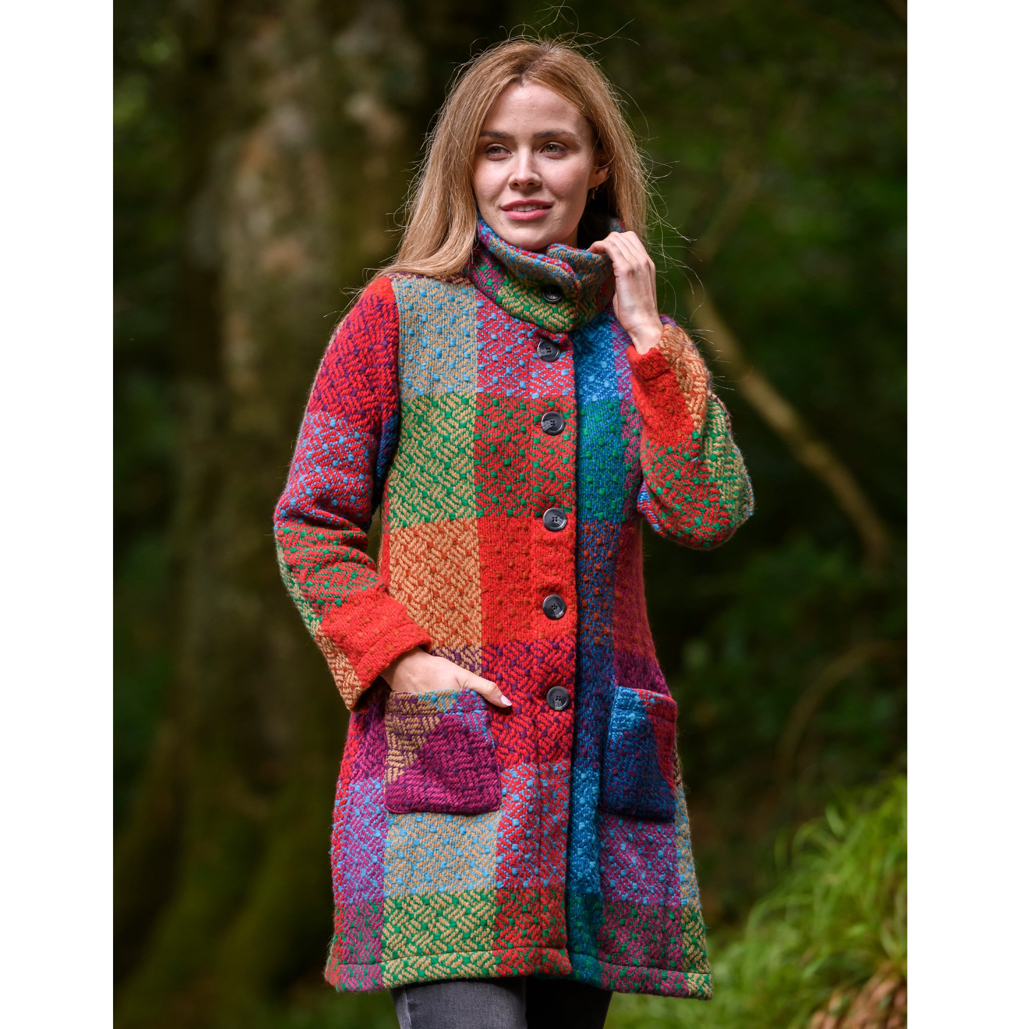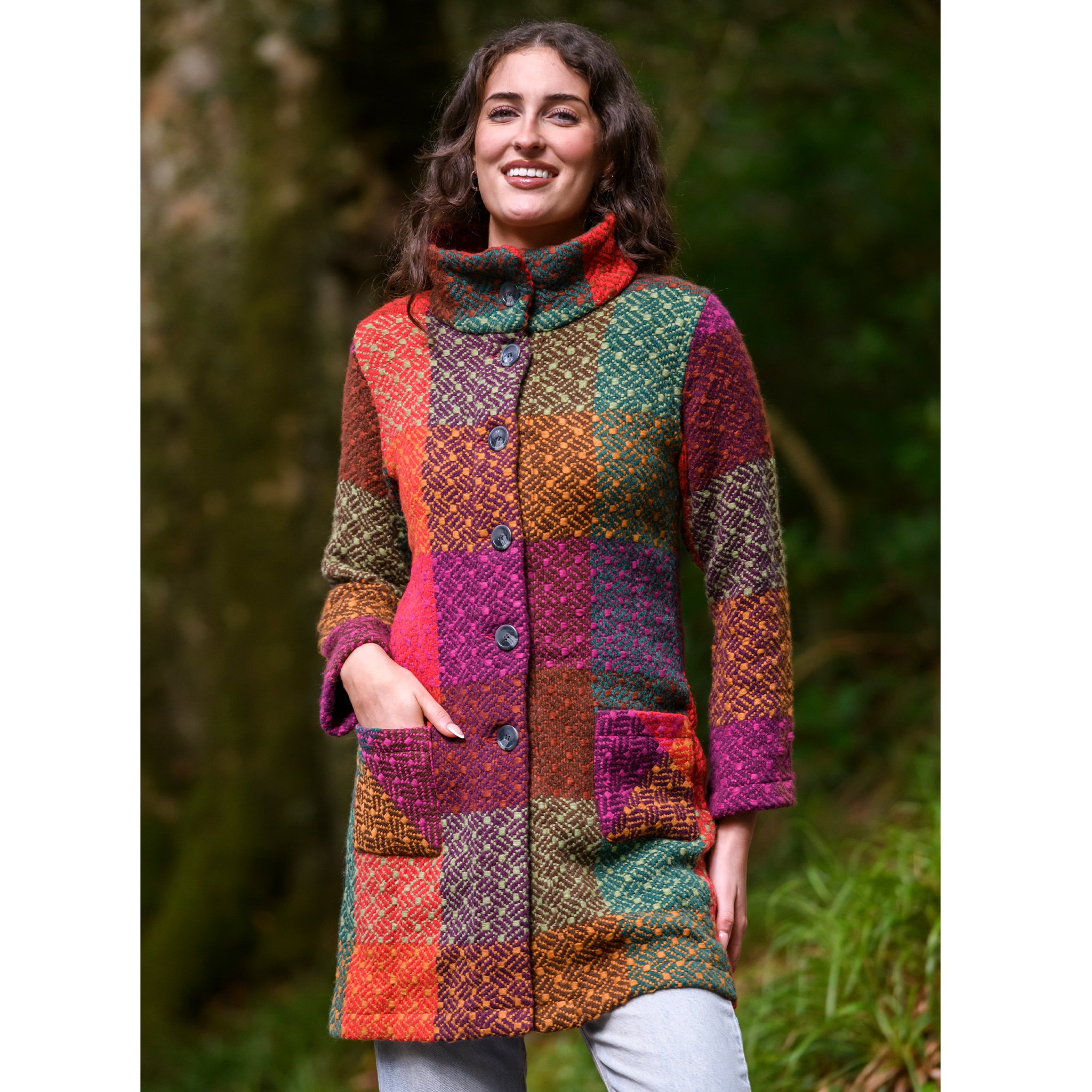 This beautiful and unusual lightweight long coat is woven from a rich wool blend at Branigan's mill in Ireland. The multi-coloured herringbone pattern is created from Black, Green & Navy tones. It's finished with velvet trim on the pockets, cuffs and long edge as well as tortoise shell buttons.