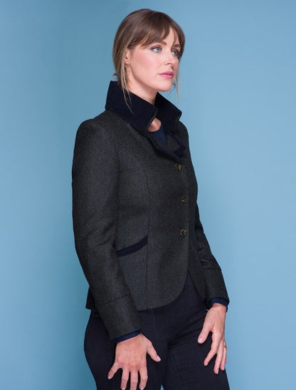 Woven from 100% wool tweed with particular attention to detail and trims on the collar and cuffs. The stunning curved front pockets and back half- belt detail make a beautiful shaped finish