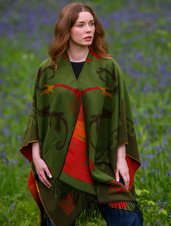 An elegant Irish fringed shawl, inspired by the ornate Celtic designs found in the pages of the Book of Kells.